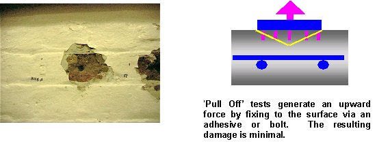 Pull Off Testing provides a field method of determining relative strength in situ, and absolute strength if calibrated against cores. This avoids the damage and nuisance of coring and exposure, where information is needed but either the position or the environment prevents more destructive approaches: this has applications ranging from high pressure pipe lines and vacuum chambers to historic fabric and retail centres.